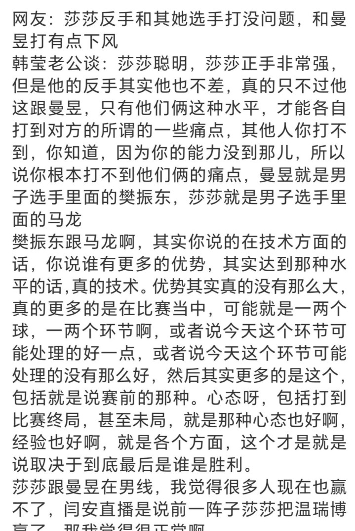 在雷洋看来孙颖莎的反手虽然不如她的正手,但也非常强,除了和另一位国乒女队头号主力王曼昱相比有点下风之外,对其他选手也不差。